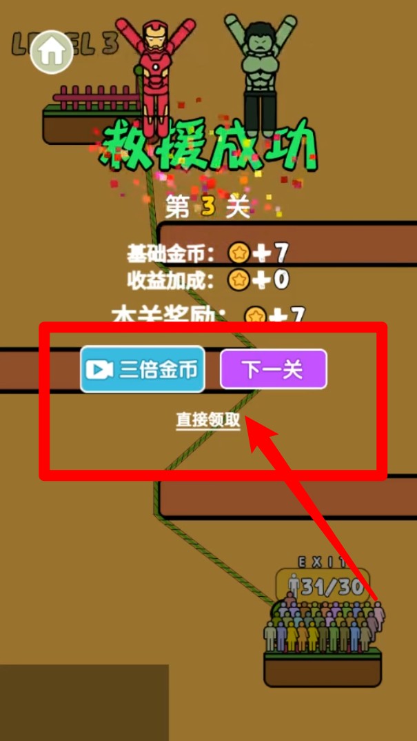 3.完成任务后会显示救援成功与奖励金币,可以选择直接领取或观看视频获取三倍金币,增加成长速度与挑战动力。