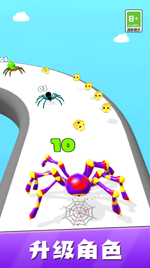 1.蜘蛛进化成长:玩家化身敏捷蜘蛛在关卡中奔跑挑战,通过吞并同等级或弱小蜘蛛完成合成升级,逐步进化成为更强存在。