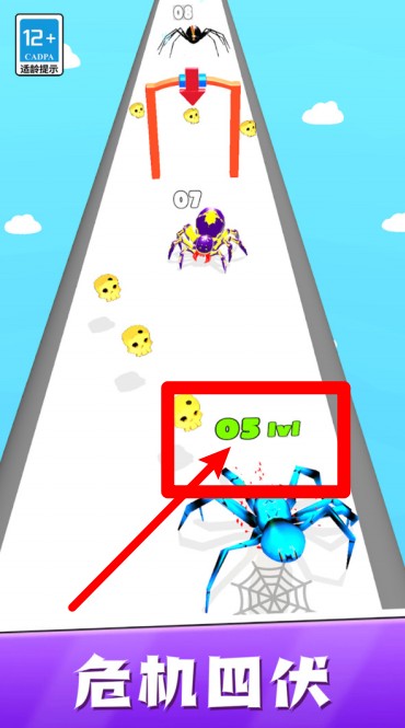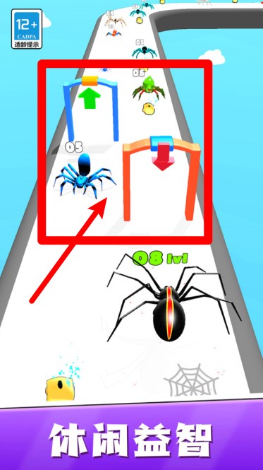 3.穿越成长通道:绿色箭头通道可提升蜘蛛等级,红色通道将降低等级,玩家需快速判断路线,确保稳定升级节奏。
