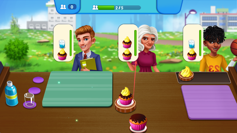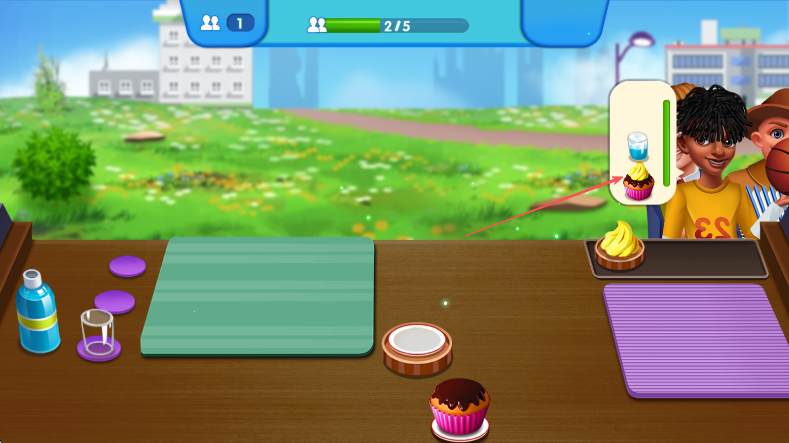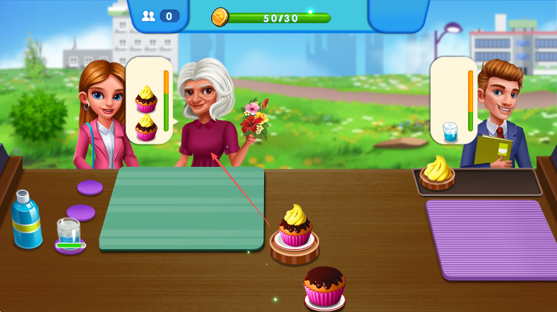 1、进入游戏,查看右上角进度条,了解顾客排队情况,观察顾客需求,比如黄色衣服顾客想要带巧克力酱的纸杯蛋糕和一杯水。