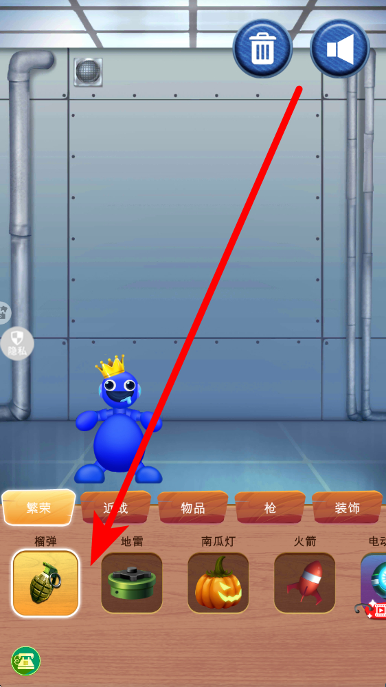 1、进入游戏,在下方道具栏选择分类,如繁荣栏选榴弹,点击榴弹道具,即可向蓝色角色投掷,触发爆炸特效,感受解压互动。