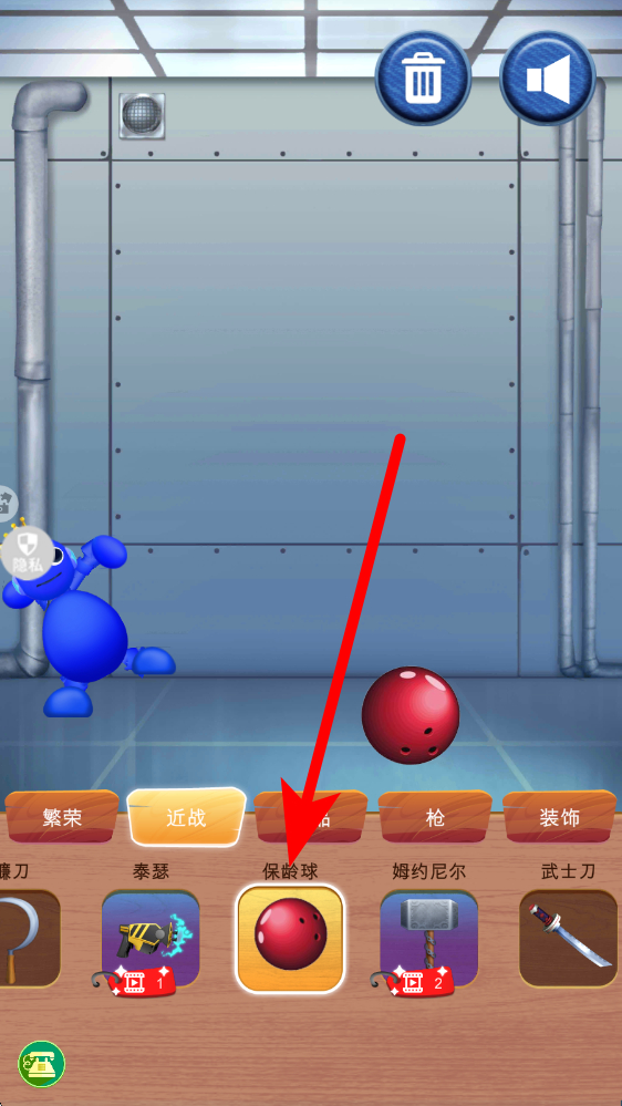 2、切换至近战栏,选保龄球道具,点击后保龄球弹出,撞击蓝色角色,使其移动、互动,利用不同近战道具,制造多样物理反馈。