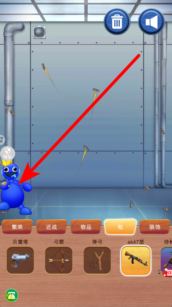 3、点击枪栏,选ak47型等枪械,点击发射,子弹命中蓝色角色,产生射击效果,通过切换各类道具,组合互动方式,实现解压体验。