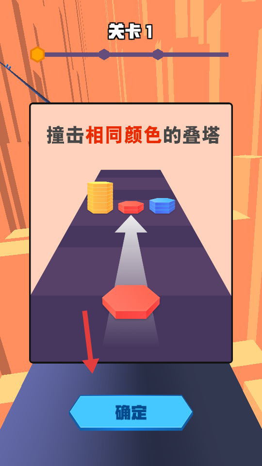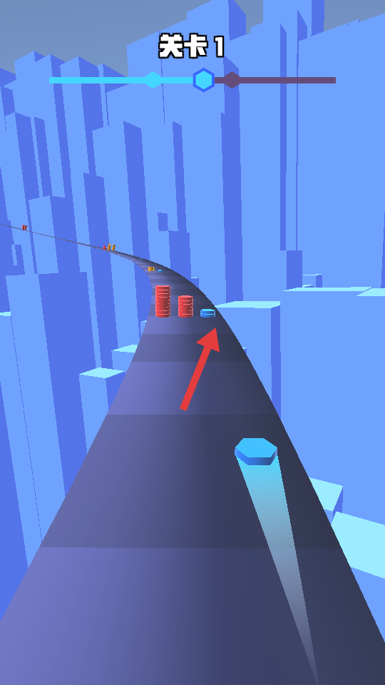 3、若撞击到不同颜色的堆塔,方块高度会减少,需继续向前移动并寻找同色堆塔补充高度,坚持到指定距离即可完成关卡,解锁新的跑酷场景。