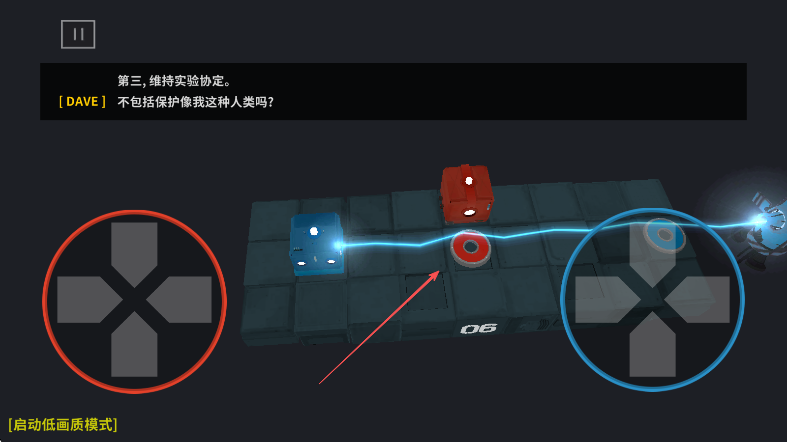 1、进入游戏先阅读屏幕上方文字对话了解背景,通过左侧虚拟按键操控红色方块前往红色光圈位置。