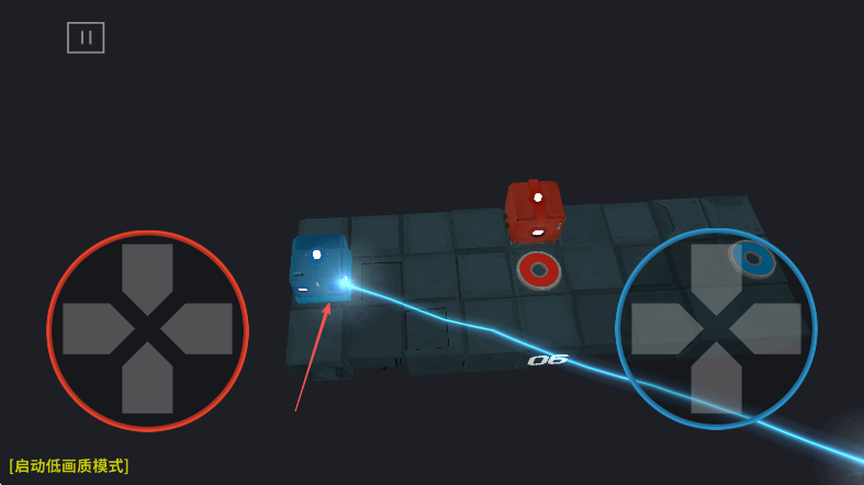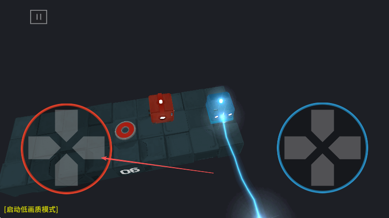 2、利用右侧虚拟按键调整视角观察蓝色方块,规划路线让蓝色方块也能进入对应光圈触发机关。