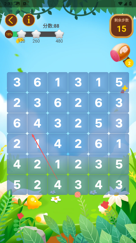 1、进入游戏查看分数88、剩余步数15,寻找相邻同数字方块,点击连线消除,获取分数。