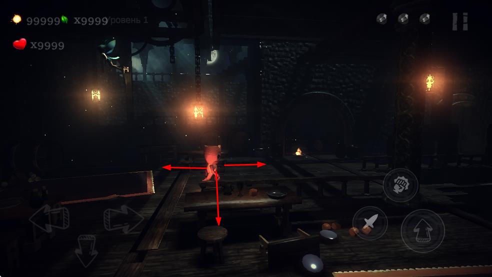 1、操控虚拟摇杆,在城堡场景移动探索,留意桌椅等互动物。