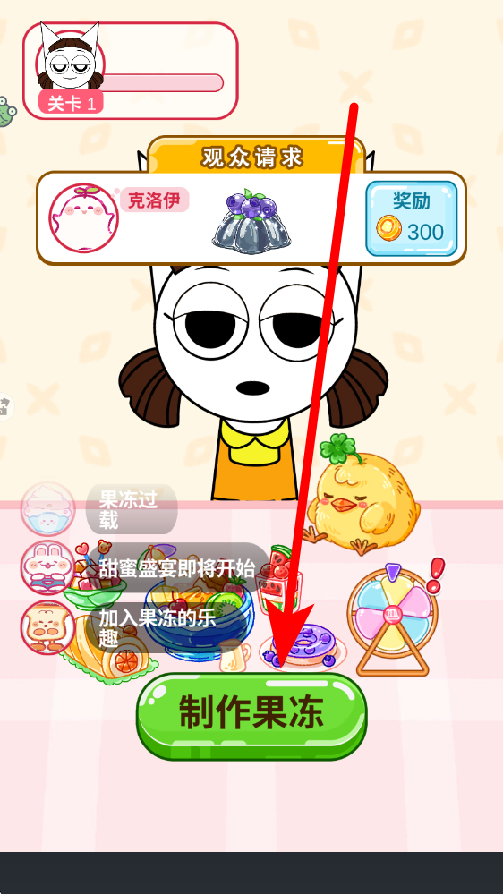 2、接收请求后,点击制作果冻按钮,进入制作界面,按步骤操作用工具处理果冻材料,完成指定果冻造型与配置,满足观众需求。