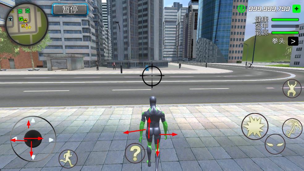 1、通过左侧摇杆操控超级英雄在城市街道移动,留意右上角健康、盔甲、能源状态,为冒险行动提供基础保障。