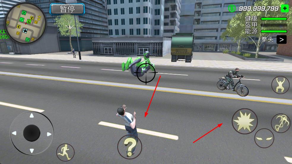 3、使用拳头或爆炸类技能图标,对城市中的目标发起攻击,同时可与行人、车辆等互动,推进冒险进程。