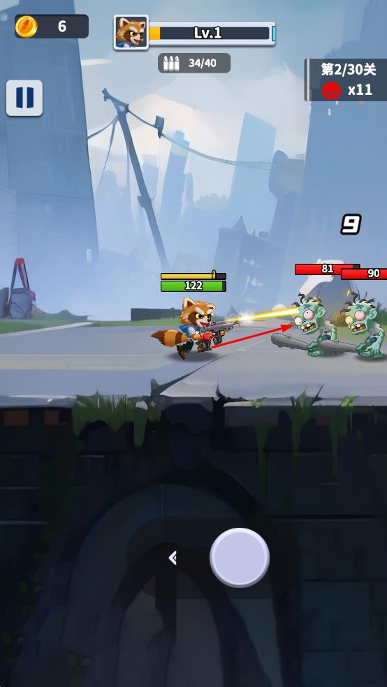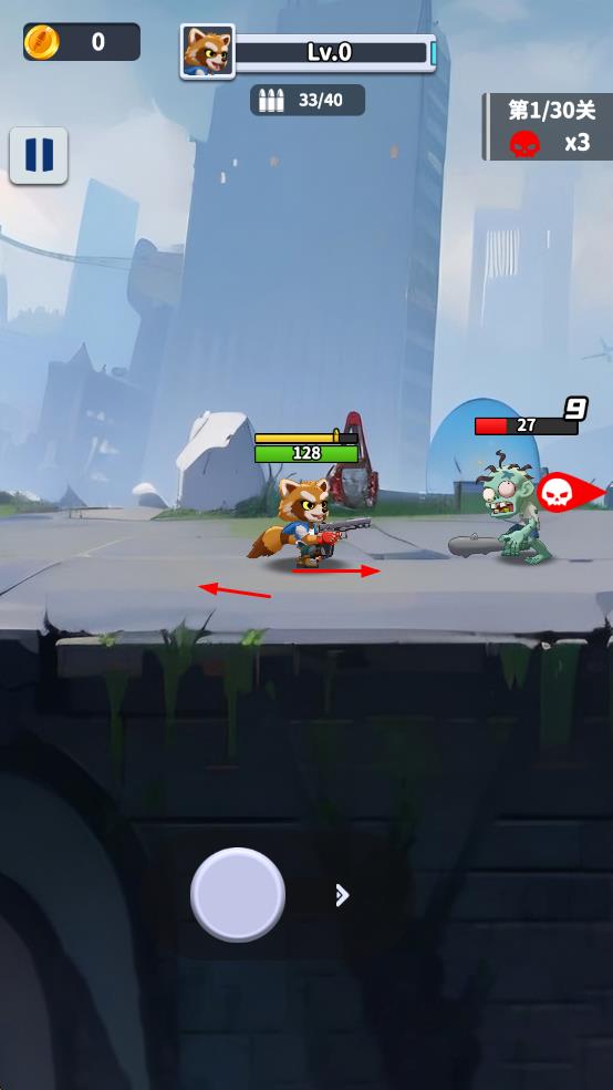 1、操控浣熊角色左右移动,瞄准僵尸类敌人进行射击,消耗敌人血量,推进第1-30关等关卡进程。