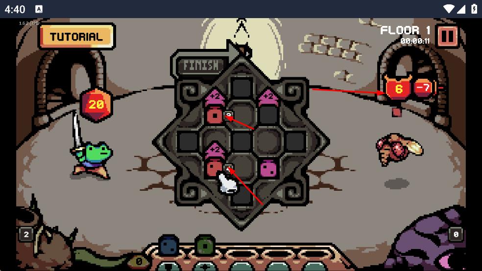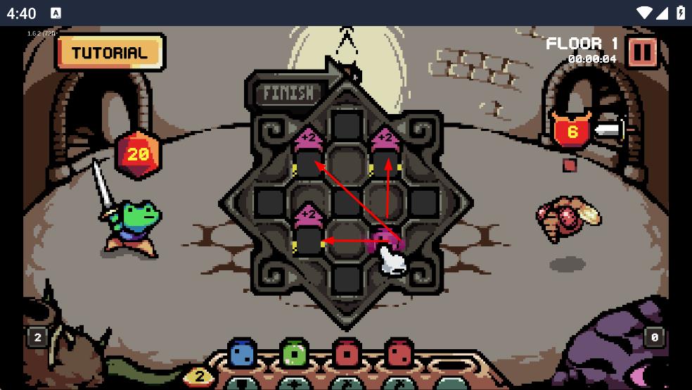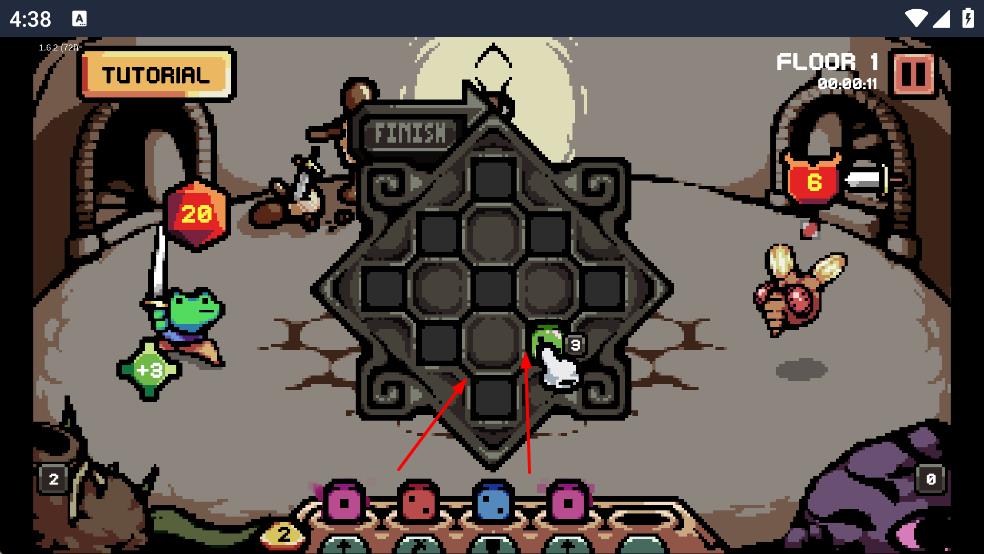 3、配合左侧青蛙等角色,完成棋盘与战斗的联动,推进地牢关卡如Floor1进程,朝着通关目标努力。
