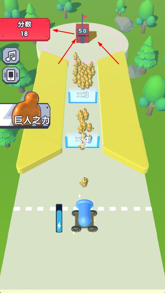 2、操控蓝色炮车,引导小人进入×3×4等倍增区域,增加小人数量,集结力量朝着目标建筑前进。