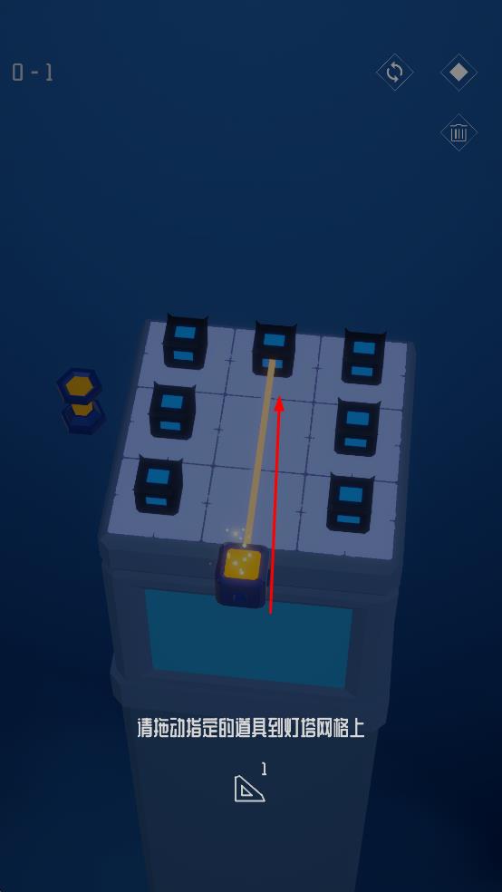 1、根据提示,拖动指定道具到灯塔的网格上,调整道具位置以构建光线路径。