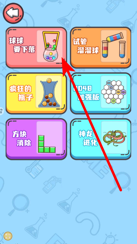 1、进入应用后,在玩法选择界面,有球球要下落试管溜溜球等多种玩法可供挑选,玩家可根据喜好,选择其中一种玩法,开启挑战。