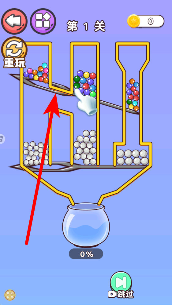 2、以球球要下落玩法为例,进入关卡第1关后,根据提示,操作机关移动阻碍球球下落的部件,让彩色球球顺利下落,朝着关卡目标推进。