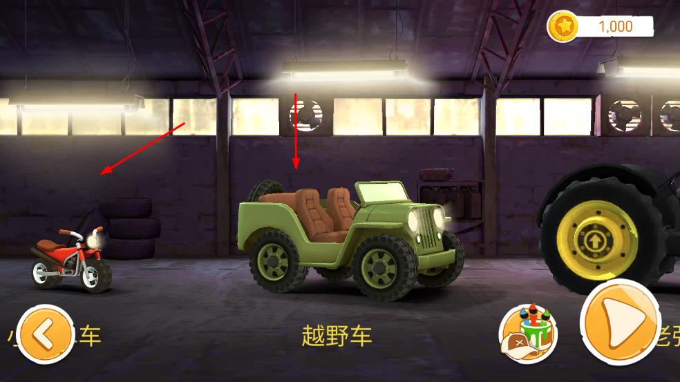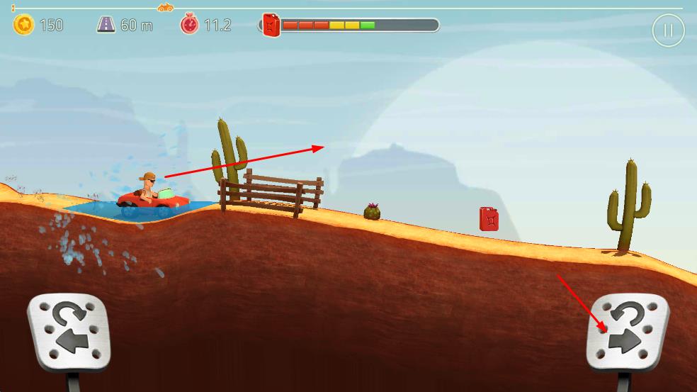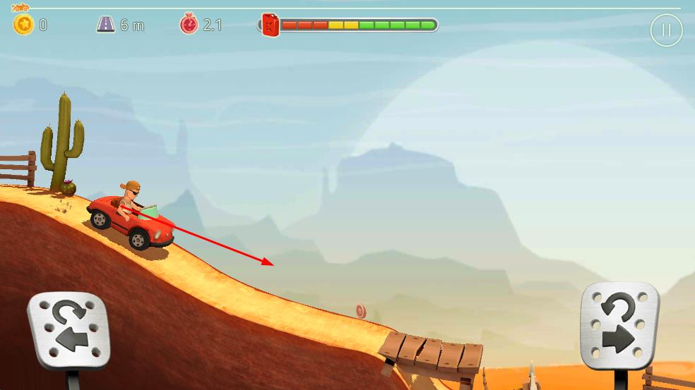 1、在沙漠等场景中,通过左右方向按钮操控车辆行驶,应对斜坡、木桥等地形,同时收集金币,积累资源。