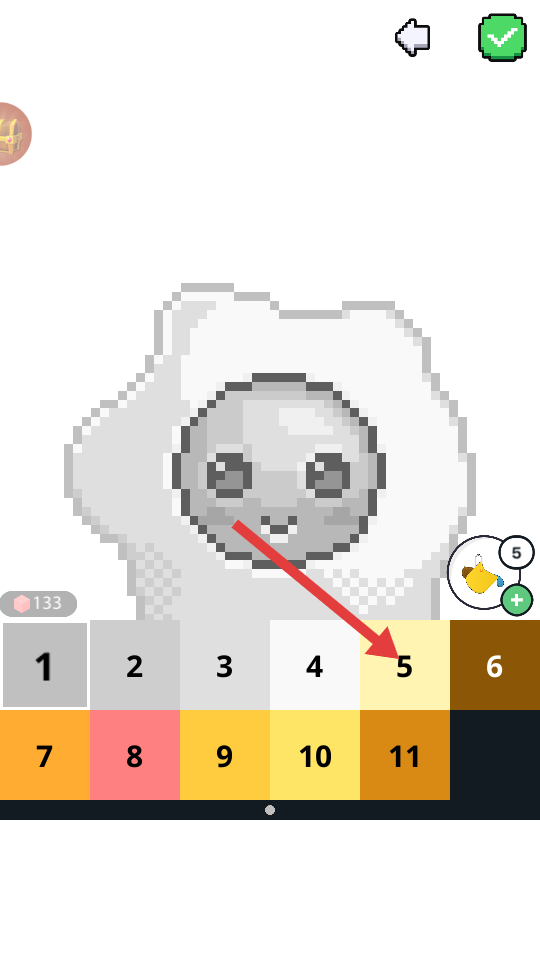 2、选择界面下方的数字,屏幕会自动定位到该数字对应的像素格子,点击颜色桶图标为这些格子填充对应颜色。