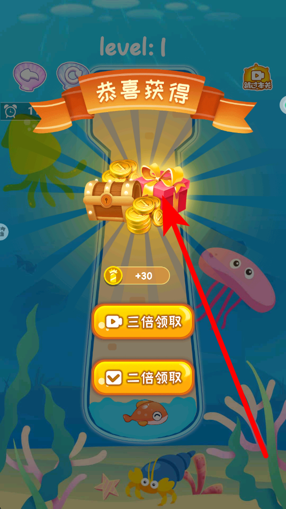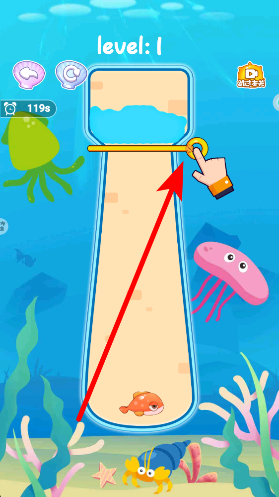 2、在关卡游玩的时候,根据提示进行简单操作,比如点击相关的机关,让场景中的海水元素小鱼等按预期移动,完成关卡要求。