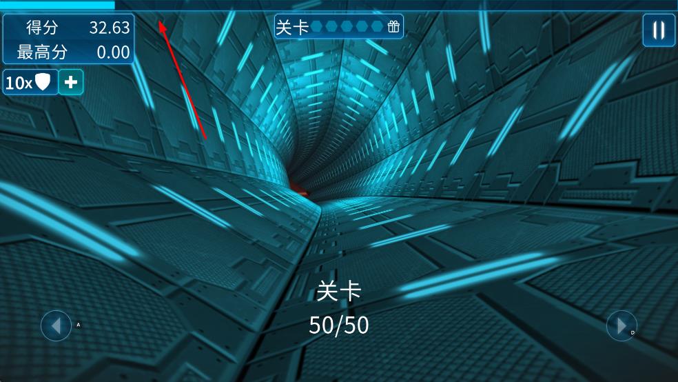 3、左上角会显示当前得分与最高分,随着关卡推进,持续在隧道中移动,提升得分。