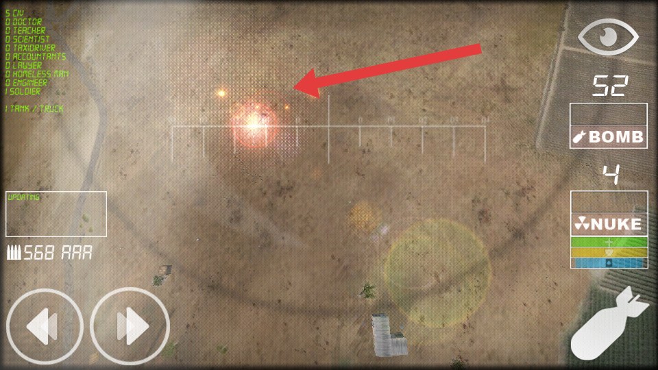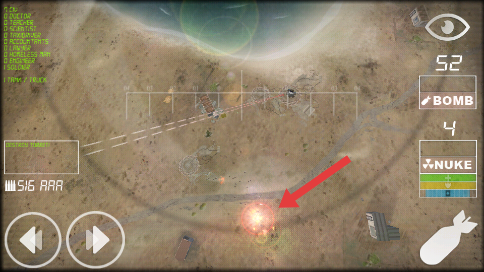 2、游戏中,看到右侧BOMB等武器标识有可使用次数时,点击武器,瞄准聚集点或重要目投放,注意目标类型选择合适武器。