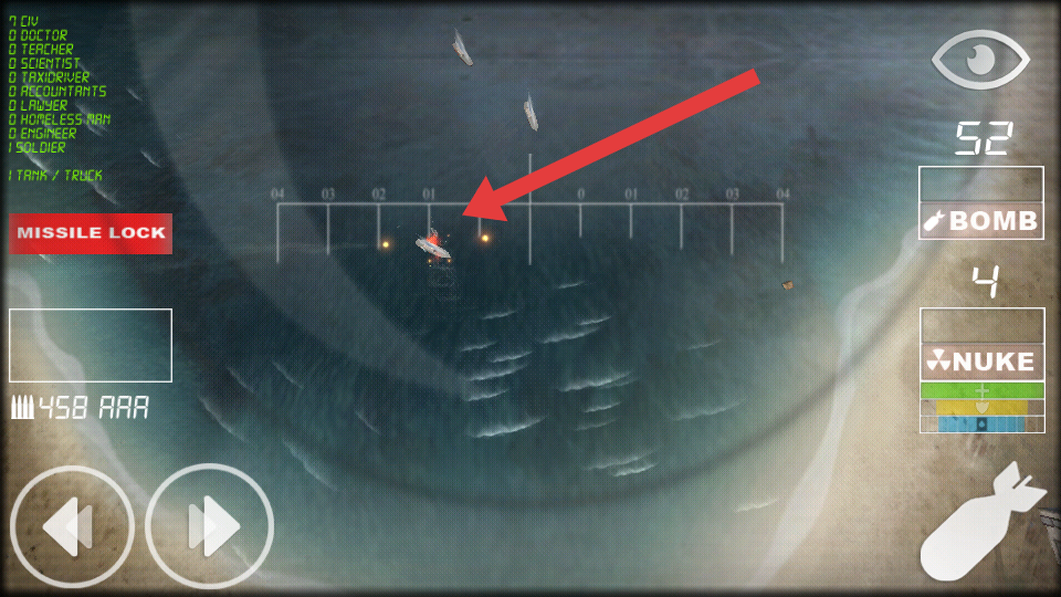 3、留意左侧平民和军事单位的标识,避免误击平民,优先打击敌方军事目标,同时关注提示,及时应对导弹的锁定等状况。