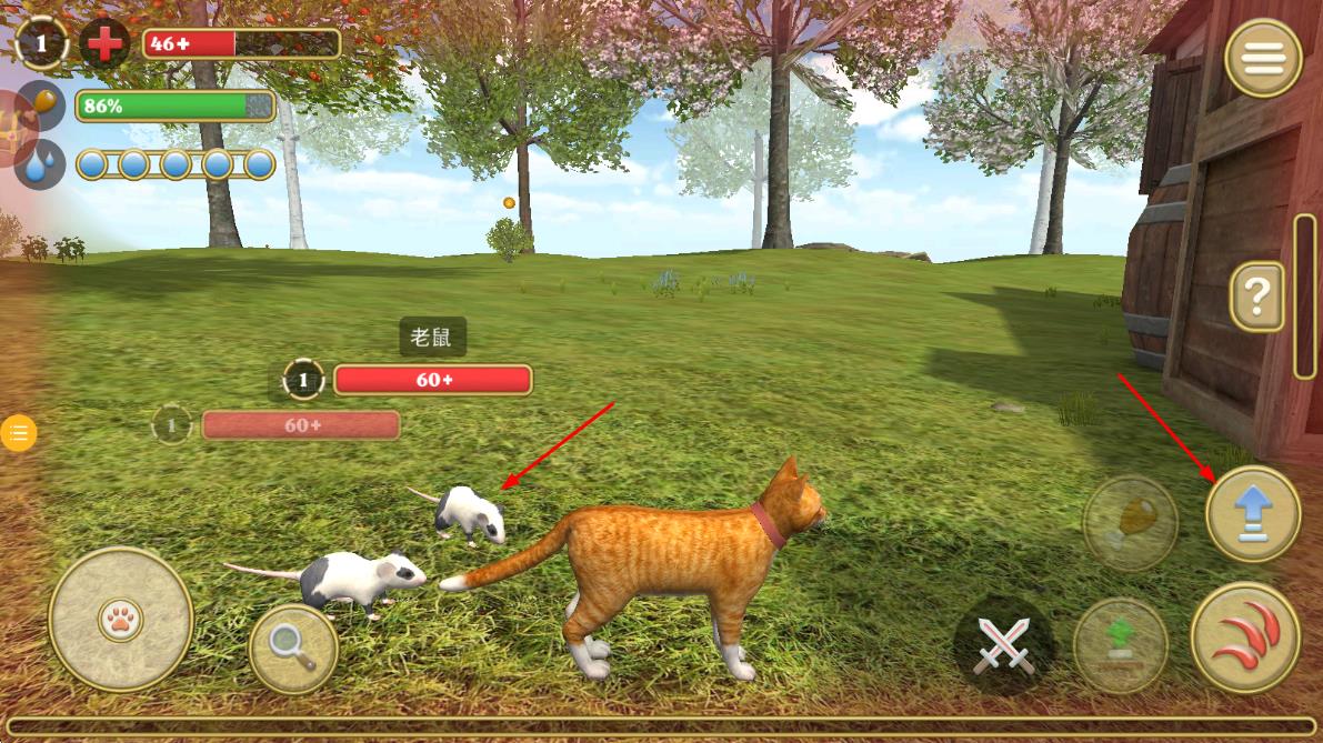 3、与【老鼠】互动时,可点击右侧向上箭头按钮,调整角色位置或进行对应操作,应对场景中的互动。