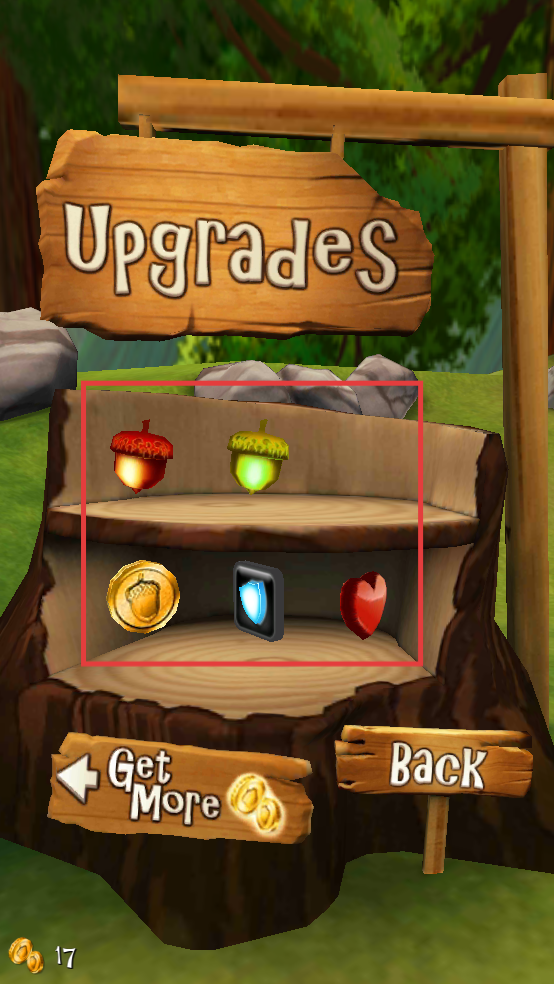 2、进入升级界面,可看到红色方框内有多种道具,像不同颜色的橡果、金币、护盾和爱心等,用收集的金币能解锁这些道具。