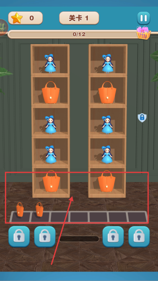 1、关卡1开始,界面显示【0/12】进度,货架上有蓝色娃娃和橙色包包,先从下方橙色包包开始收集。