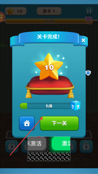 3、当进度达到【12/12】时,关卡完成,会获得【10】颗星,此时可点击【下一关】继续游戏。