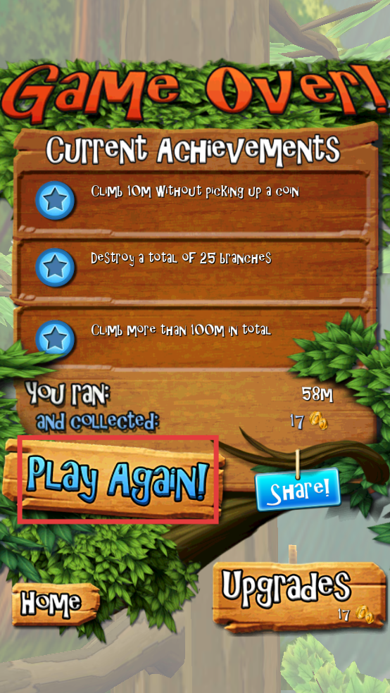 3、游戏结束后,界面会展示当前成就,若想重新游玩,点击红色方框内的Play Again按钮即可再次开始游戏。
