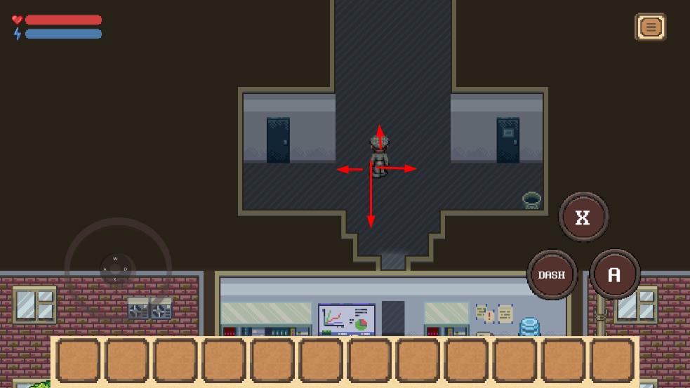 1、场景探索操控角色在室内、野外草地、村庄移动,利用虚拟摇杆上下左右行动。