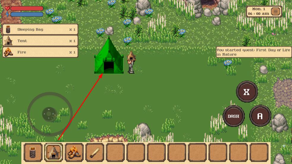 2、道具互动在野外放置帐篷、睡袋、火堆等道具,点击使用如进入帐篷休息。