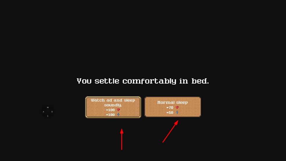 3、休息恢复睡觉时可选看广告深度睡眠大幅恢复生命、体力或正常睡眠少量恢复。