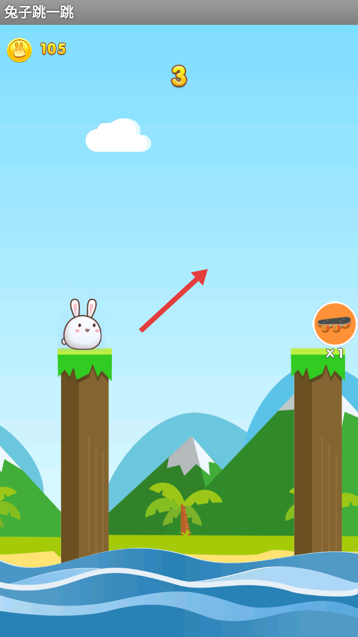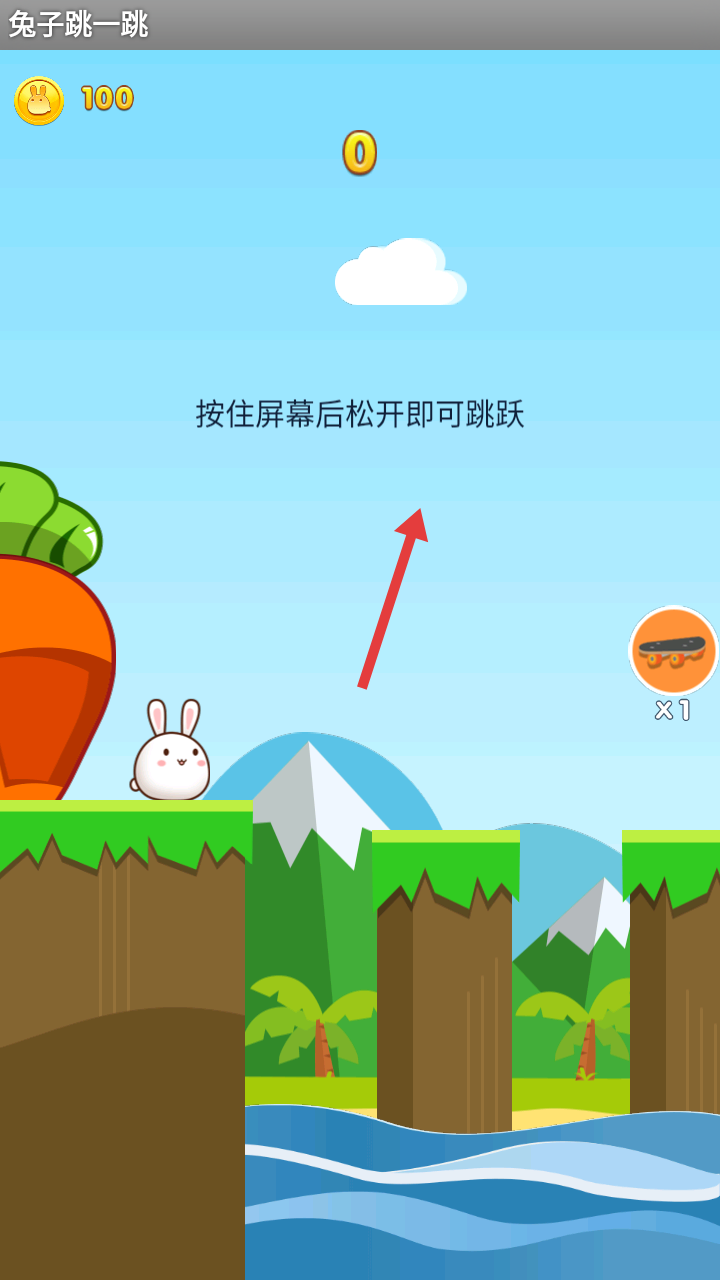 1、进入游戏主界面后,点击开始跑酷选择初始兔子形象,进入关卡后长按屏幕蓄力,观察屏幕上的力度条,松开手指即可让兔子向前跳跃,尝试落在前方第一个木桩上。
