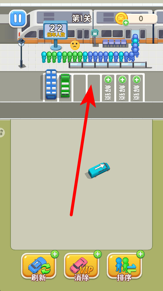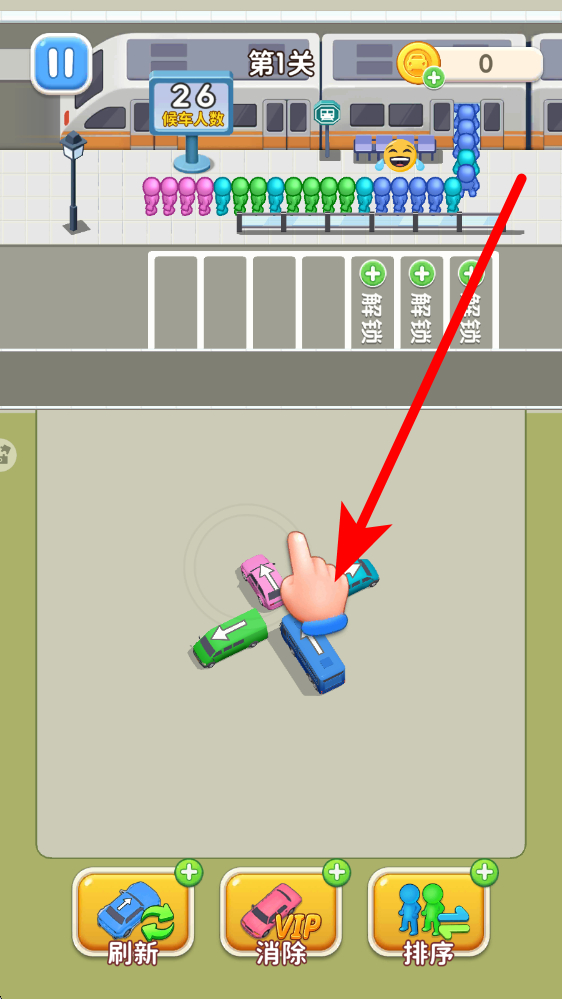 1、打开游戏后,在关卡场景中,会看到多辆停放的车辆,需观察车辆的位置与可移动方向,通过点击等操作,移动车辆,为目标车辆开辟道路。