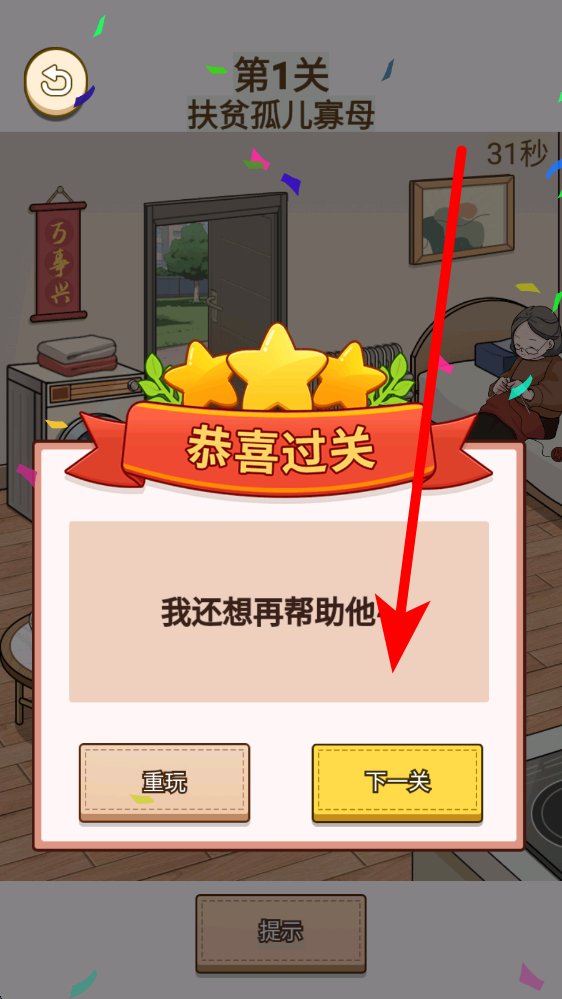 3、当成功完成当前关卡的任务后,会出现恭喜过关的提示,此时可点击下一关,继续挑战新的关卡,体验不同的剧情与互动,感受关卡乐趣。