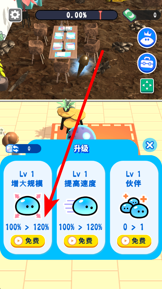 2、在史莱姆升级界面,可选择增大规模提高速度伙伴等升级选项,提升史莱姆的各项能力,让史莱姆在后续互动中更具优势。