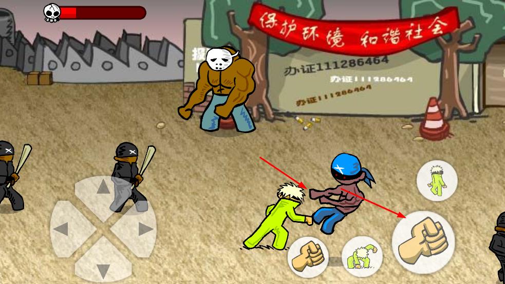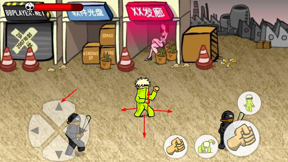 1、使用方向键操控角色移动,在场景中灵活调整位置,点击拳头按键发起攻击,应对持械敌人,开启格斗对抗。