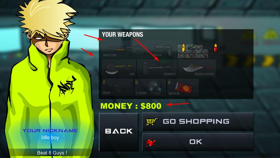 2、武器购买系统使用:通过战斗积累金钱后,可在商店购买多样武器,不同武器有不同攻击范围与威力,需根据敌人类型与关卡特点选择合适武器,优化战斗效率,提升获胜几率。