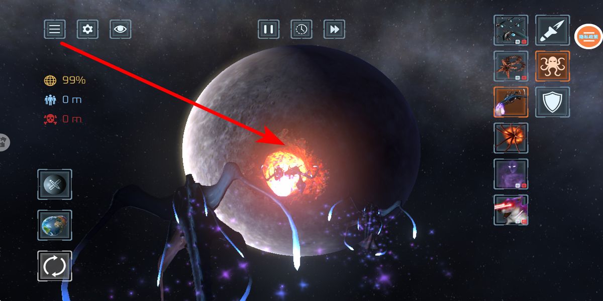 2、右侧会出现各类道具,像不同的武器或特殊能力图标,点击这些道具,就能调用相应手段对星球进行破坏,感受毁灭星球的效果。