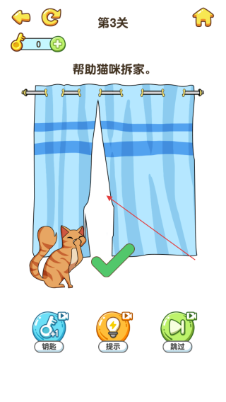 3、当猫咪成功拆家,出现绿色对勾标志后,点击弹出的下一关按钮,进入下一个关卡挑战。