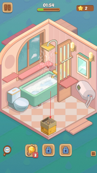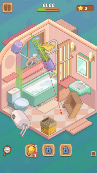 2、根据浴室布局和需求,将获取的道具如置物架、水桶等放置到合适位置,每成功放置合理物品可获一颗星星。