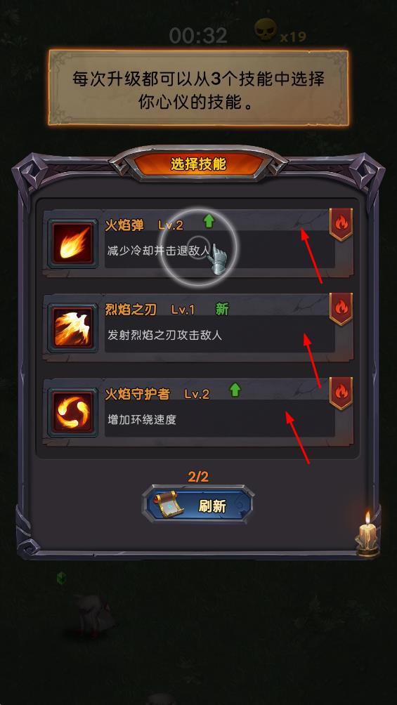 3、升级从火焰弹,烈焰之刃,火焰守护者等3个技能中选择心仪技能,强化战力,更高效地冒险。