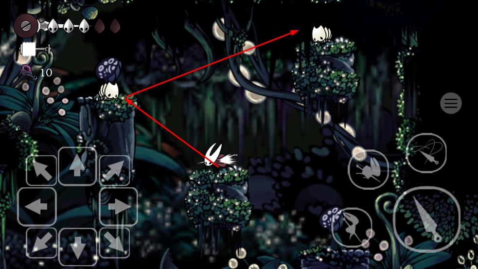 1、在幽暗的游戏场景中,通过左侧方向键操控角色移动,可上下左右灵活穿梭,探索充满植被与特殊地貌的区域。