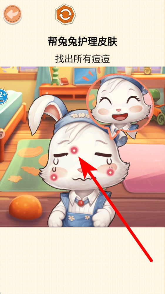 3、比如帮兔兔护理皮肤关卡,按照关卡提示找出所有痘痘,仔细观察角色,点击兔兔脸上的痘痘等目标,完成关卡任务享受乐趣。