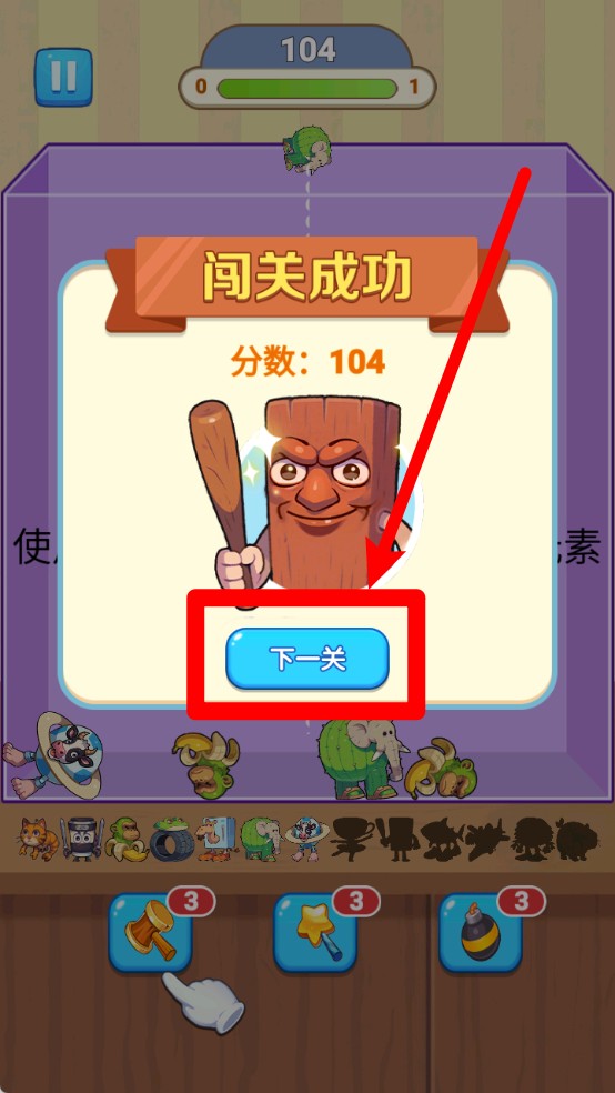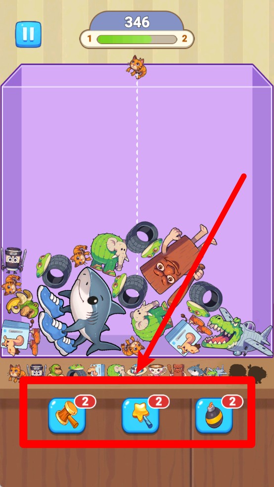 2.当屏幕内的物品逐渐堆积占据空间时,玩家可以使用下方的锤子星星炸弹等道具,快速清理杂物并保持画面整洁。
