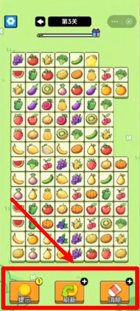 3.底部提供提示刷新与消除等辅助功能,可以灵活使用这些道具,在关键时刻帮助通过关卡,提升闯关乐趣。
