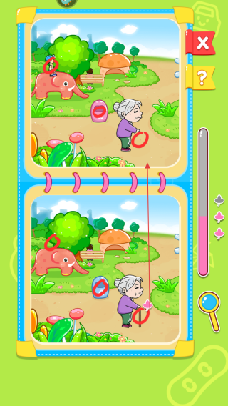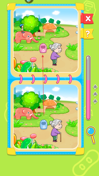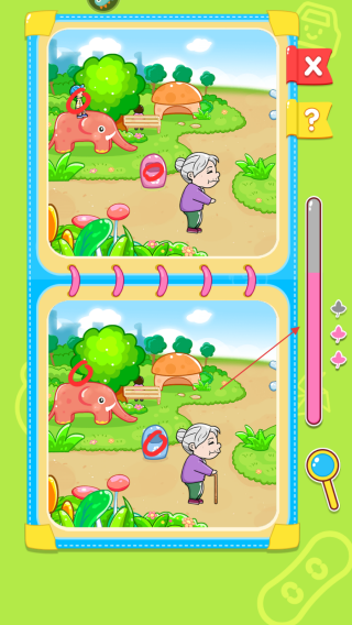 2、分阶难度关卡体系:40多个关卡按难度梯度设计,初期关卡差异点明显,适合低龄宝宝入门,后期关卡差异点更隐蔽如细节装饰、微小位置移动。